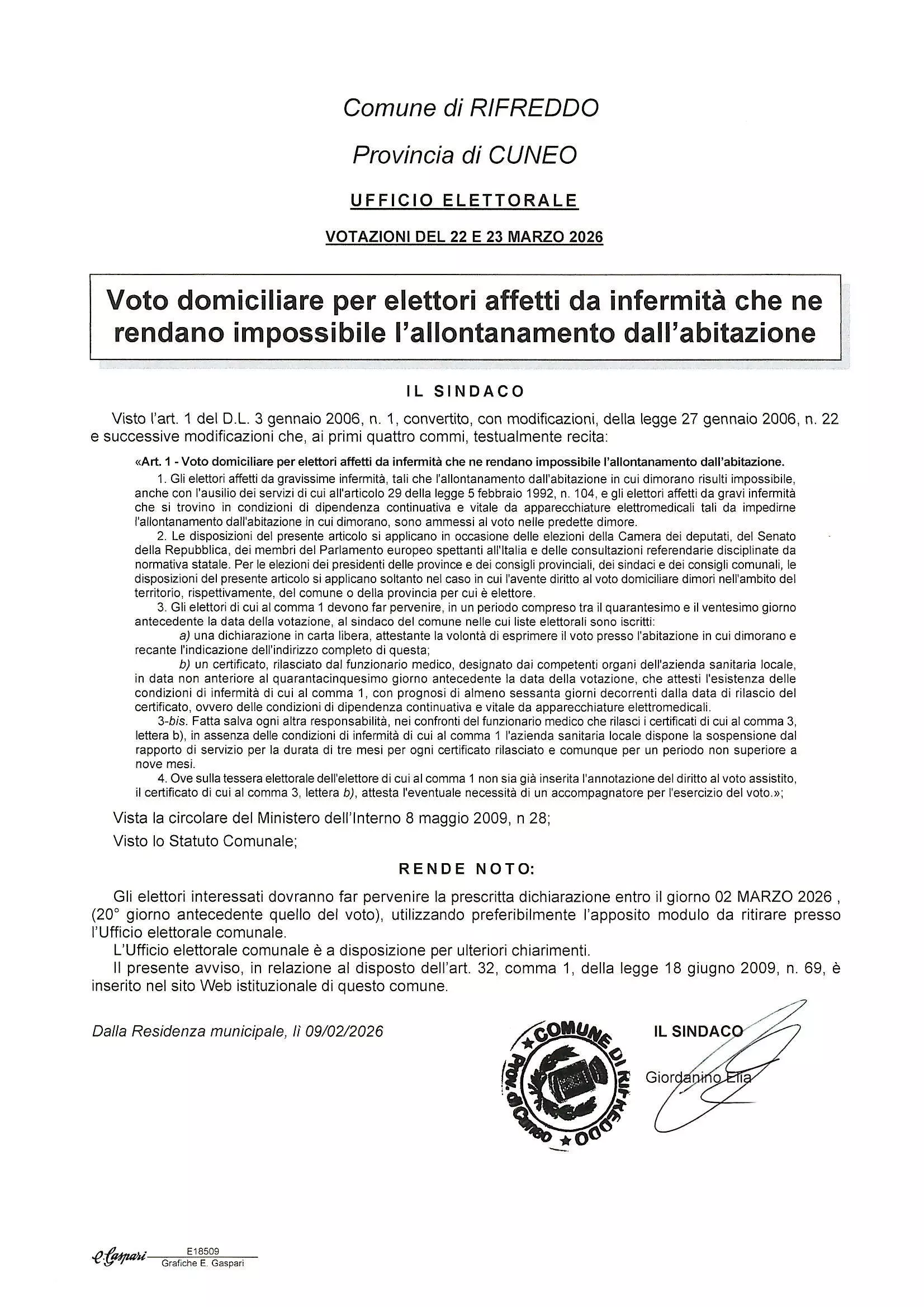 La richiesta deve pervenire presso l'ufficio elettorale del Comune di Rifreddo entro il 02 marzo 2026.